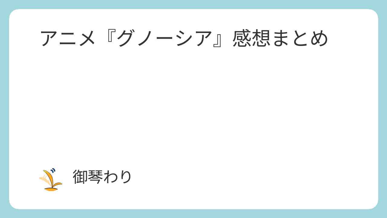 アニメ『グノーシア』感想まとめ X Bluesky Misskey Facebook LINE コピー 2025/11/132025/11/17 『グノーシア』感想記事一覧 アニメ『グノーシア』の各話感想をまとめています。ネタバレ注意! アニメ『グノーシア』5話 『 野生の勘』感想|ユーリくん……やるな!2025年11月17日 アニメ『グノーシア』4話 『銀の鍵』感想|夕里子の圧倒的存在感なに?2025年11月13日 アニメ『グノーシア』3話 感想|新キャラ&役職追加、成長するユーリ2025年11月8日 アニメ『グノーシア』2話『ループ』 感想|人狼の苦手な部分2025年11月3日 アニメ『グノーシア』1話 感想2025年10月29日