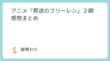 アニメ感想記事 総合 X Bluesky Misskey Facebook LINE コピー 2025/11/172026/1/17スポンサーリンク スポンサーリンク 感想記事 まとめのまとめこのページでは今まで書いてきたアニメの感想を記事を作品ごとのまとめページに飛べるようにしてるよ。 アニメ『葬送のフリーレン』2期 感想まとめ『葬送のフリーレン』感想記事一覧アニメ『葬送のフリーレン』2期の各話感想をまとめています。ネタバレ注意! アニメ『勇者のクズ』感想まとめ『勇者のクズ』感想記事一覧アニメ『勇者のクズ』の各話感想をまとめています。ネタバレ注意! アニメ『グノーシア』感想まとめ『グノーシア』感想記事一覧アニメ『グノーシア』の各話感想をまとめています。ネタバレ注意! アニメ『アークナイツ』感想まとめ『アークナイツ』感想記事一覧アニメ『アークナイツ』の各話感想をまとめています。ネタバレ注意! アニメ『チ。』感想まとめ『チ。』感想記事一覧アニメ『チ。』の各話感想をまとめています。ネタバレ注意!