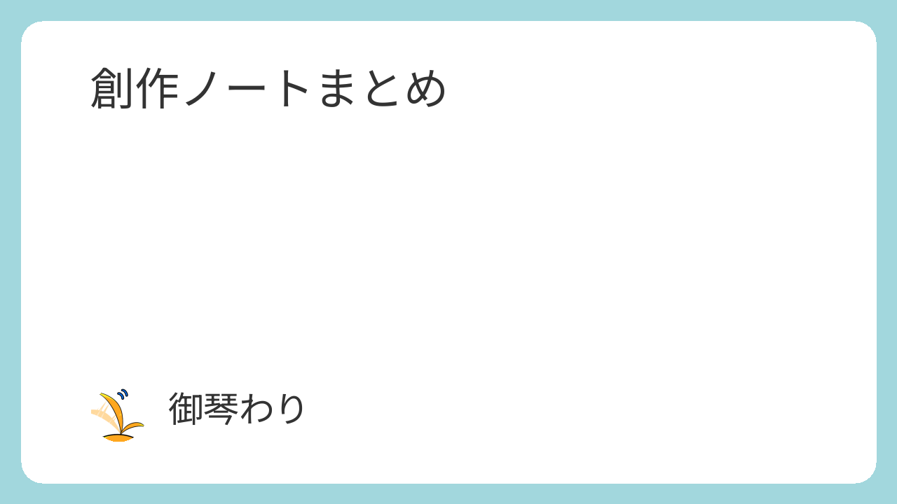 創作ノートまとめ X Bluesky Misskey Facebook LINE コピー 2025/11/27 スポンサーリンク スポンサーリンク 『創作ノート』記事一覧 創作ノートに関連する記事をまとめています。あなたの創作の種に役立てば幸いです。 創作の種になる“運命”の考え方|運命は決まっているのか?